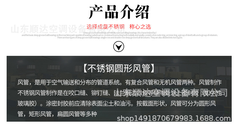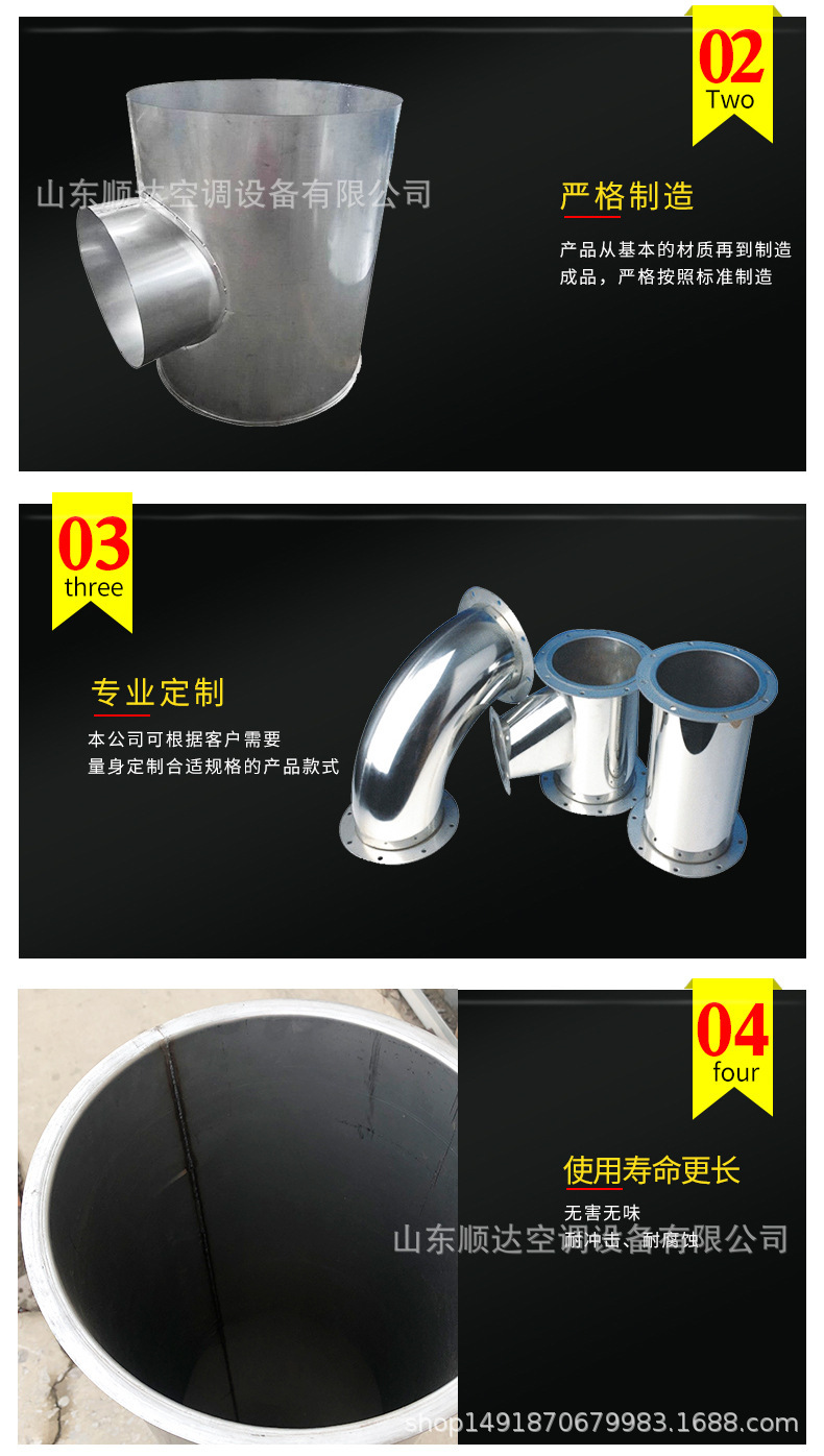 不銹鋼風(fēng)管,不銹鋼風(fēng)管可分為圓形和矩形兩種??筛鶕?jù)工程現(xiàn)場的不同要求,生產(chǎn)各種形狀、各種規(guī)格型號及板材的成品風(fēng)管。不銹鋼風(fēng)管主要材質(zhì)有:SUS304、316、303、310、310S、301、302、304L、316L 、321、201、202、902、904、317、430等。不銹鋼風(fēng)管表面性質(zhì)主要有8K鏡面板、彩色不銹鋼板、不銹鋼磨砂板、不銹鋼拉絲板、不銹鋼花紋板、不銹鋼蝕刻板、鈦金、雪花砂、2B板、BA板和工業(yè) [1]  中厚板。不銹鋼風(fēng)管成品因其優(yōu)異的耐蝕性、耐熱性、高強(qiáng)度等物化性能,主要應(yīng)用于多種氣密性要求較高的工藝排氣系統(tǒng)、溶劑排氣系統(tǒng)、有機(jī)排氣系統(tǒng)、廢氣排氣系統(tǒng)及普通排氣系統(tǒng)室外部分、濕熱排氣系統(tǒng)、排煙除塵系統(tǒng)等。